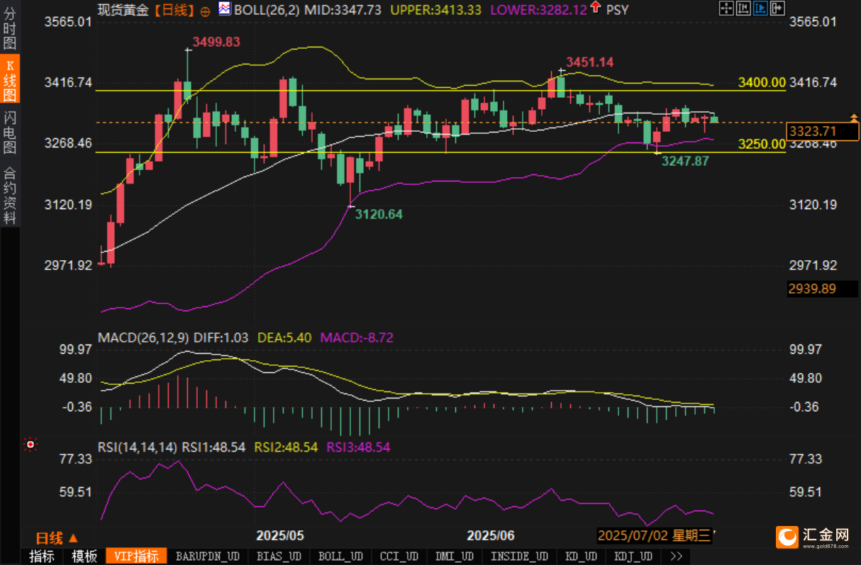 现货黄金价格(XAU/USD)周二(7月8日)欧洲时段维持弱势震荡,交投于3320美元附近,尽管基本面偏空,但多空双方陷入胶着,黄金走势暂时受限于短期技术结构及避险情绪博弈。